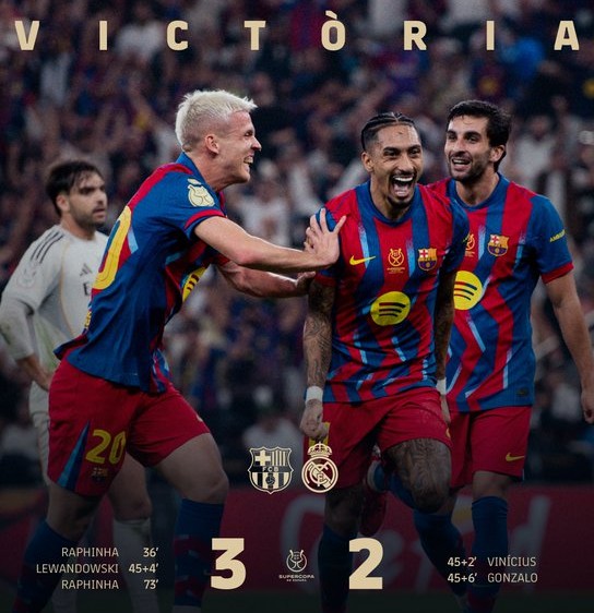 Παρά την αποβολή του Ντε Γιόνγκ στις καθυστερήσεις και την πίεση της Ρεάλ, οι Καταλανοί άντεξαν, με τις μεγάλες ευκαιρίες των Μαδριλένων να μην βρίσκουν στόχο. Έτσι, η Μπαρτσελόνα πανηγύρισε ακόμη ένα Σούπερ Καπ, επιβεβαιώνοντας την υπεροχή της στον τελικό.