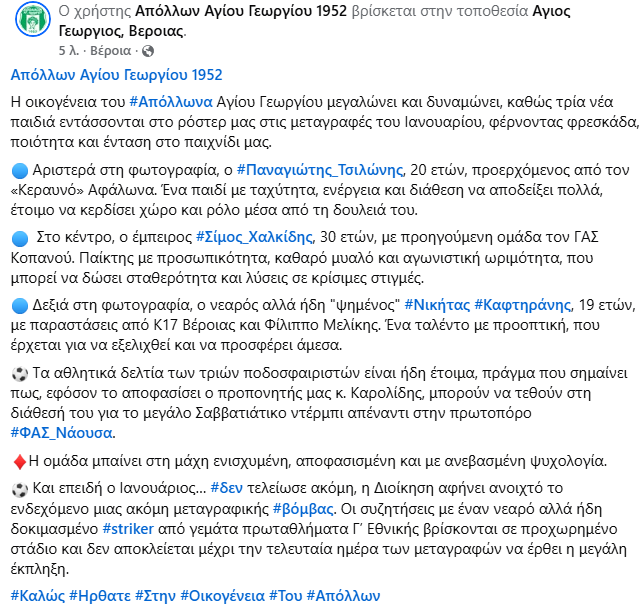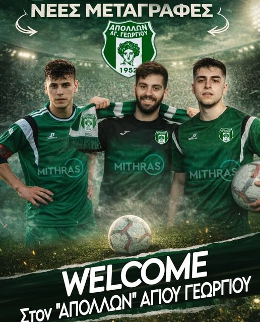 Με τρεις προσθήκες ενισχύθηκε ο Απόλλων Αγίου Γεωργίου στη μεταγραφική περίοδο του Ιανουαρίου. Στο ρόστερ εντάχθηκε ο 20χρονος Παναγιώτης Τσιλώνης, ο οποίος προέρχεται από τον Κεραυνό Αφάλωνα στην ΕΠΣ Λέσβου. Παράλληλα, αποκτήθηκε ο 30χρονος Σίμος Χαλκίδης, με προηγούμενη ομάδα τον ΓΑΣ Κοπανού, προσθέτοντας εμπειρία στη μεσαία γραμμή. Η τρίτη μεταγραφή αφορά τον 19χρονο Νικήτα Καφτηράνη, που έχει αγωνιστεί στα τμήματα Κ17 της Βέροιας και στον Φίλιππο Μελίκης.