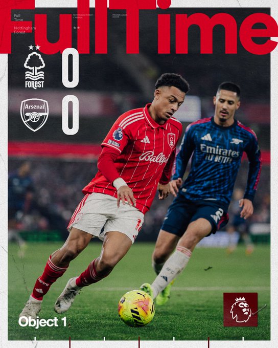 Το παιχνίδι ξεκίνησε μουδιασμένα, με την πρώτη μεγάλη ευκαιρία να καταγράφεται στο 29’, όταν ο Γκάμπριελ Μαρτινέλι αστόχησε σε τεράστια στιγμή. Οι «κανονιέρηδες» πίεσαν ιδιαίτερα στο δεύτερο ημίχρονο, κυρίως μεταξύ 59’ και 72’, με Μικέλ Μερίνο, Μπουκάγιο Σάκα και Ντέκλαν Ράις να δοκιμάζουν το γκολ, αλλά ο τερματοφύλακας Ματς Σελς κράτησε το μηδέν. Η Νότιγχαμ Φόρεστ είχε ελάχιστες ευκαιρίες και αμύνθηκε αποτελεσματικά, εξασφαλίζοντας την ισοπαλία μέχρι το τέλος.