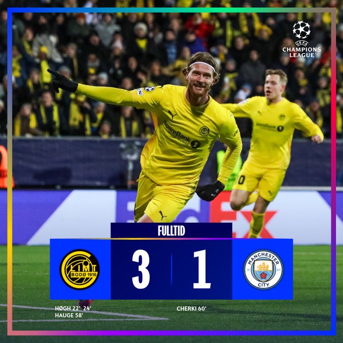Την ίδια ώρα, τεράστια έκπληξη σημειώθηκε στη Νορβηγία, όπου η Μπόντο Γκλιμτ υπέταξε με 3-1 τη Μάντσεστερ Σίτι. Με πρωταγωνιστή τον Χεγκ και εκμεταλλευόμενη την αποβολή του Ρόδρι, η πρωταθλήτρια Νορβηγίας πήρε την πρώτη της νίκη και διατήρησε ζωντανές τις ελπίδες πρόκρισης, την ώρα που οι «πολίτες» προβλημάτισαν έντονα.