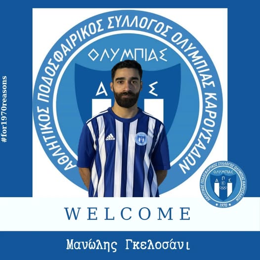 “Η Ολυμπιάδα Καρουσάδων ανακοινώνει την απόκτηση του ποδοσφαιριστή Μανώλη Γκελοσάνι, ο οποίος εντάσσεται στο ρόστερ της ομάδας μας ενόψει της συνέχειας των αγωνιστικών υποχρεώσεων.