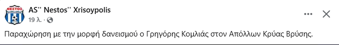 Τον δανεισμό του Γρηγόρη Κόμλια στον Απόλλωνα Κρύας Βρύσης ανακοίνωσε ο Νέστος Χρυσούπολης. Ο 19χρονος επιθετικός (γενν. 16/10/2006) κατάγεται από την Καβάλα και αγωνίζεται στην επιθετική γραμμή. Τη φετινή σεζόν κατέγραψε μία συμμετοχή στο Κύπελλο Ελλάδας με τη φανέλα του Νέστου, ενώ στο παρελθόν έχει αγωνιστεί στην Αναγέννηση Λιμεναριών.
