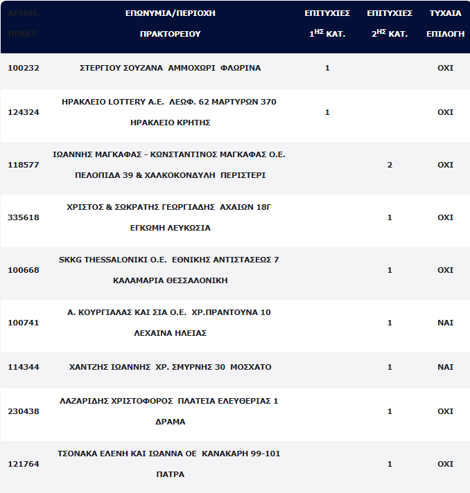 Παράλληλα, εννέα (9) δελτία αναδείχθηκαν νικητές στη 2η κατηγορία (5), με κέρδη 100.000 ευρώ για κάθε επιτυχία, σε πρακτορεία σε όλη την Ελλάδα και την Κύπρο.