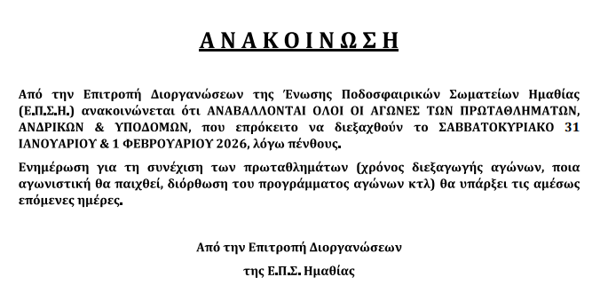 Την αναβολή όλων των προγραμματισμένων αγώνων για το Σαββατοκύριακο 31 Ιανουαρίου και 1 Φεβρουαρίου 2026 ανακοίνωσε η Επιτροπή Διοργανώσεων της ΕΠΣ Ημαθίας. Η απόφαση αφορά το σύνολο των πρωταθλημάτων αρμοδιότητάς της, δηλαδή τις κατηγορίες Ανδρών, Υποδομών και Γυναικών, και ελήφθη λόγω πένθους.