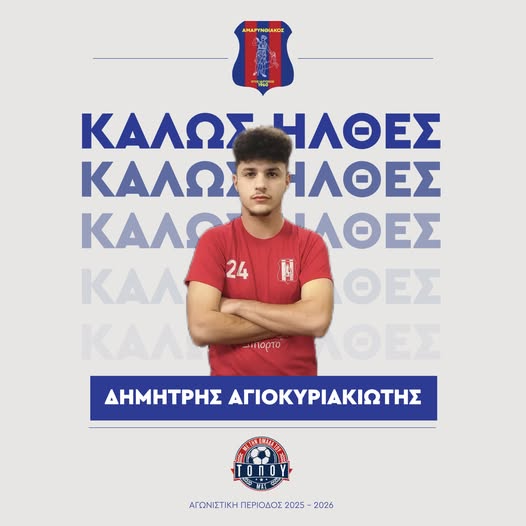 Ο Αμαρυνθιακός ενίσχυσε το έμψυχο δυναμικό του με την απόκτηση του Δημήτρη Αγιοκυριακιώτη. Ο νεαρός τερματοφύλακας, γεννημένος το 2008, εντάσσεται στο ρόστερ της ομάδας προερχόμενος από τον ΠΑΣ Ωρωπού.