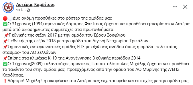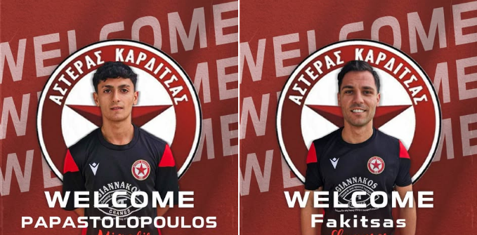 Διπλή ενίσχυση ανακοίνωσε ο Αστέρας Καρδίτσας, με τον 31χρονο Λάμπρο Φακίτσα και τον 17χρονο Μιχάλη Παπαστολόπουλο να εντάσσονται στο ρόστερ της ομάδας.