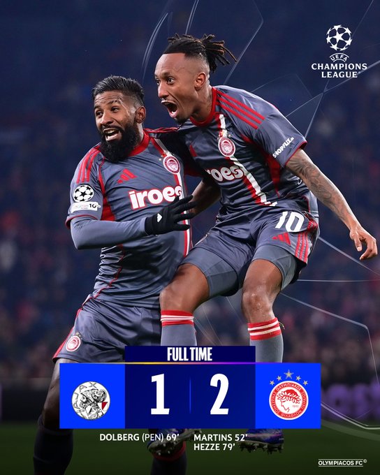 Ο Ολυμπιακός πέτυχε μια σπουδαία νίκη στην αποψινή αναμέτρηση με τον Άγιαξ στην επιβλητική Γιόχαν Κρόιφ Αρένα, εξασφαλίζοντας την παρουσία του στην επόμενη φάση του Champions League ως 18ος και περιμένοντας πλέον την κλήρωση της Παρασκευής για να μάθει τον αντίπαλό του στα Play Off. Η αναμέτρηση είχε όλα τα χαρακτηριστικά ενός θρίλερ, με ένταση, δυνατές φάσεις και εναλλαγές στο σκορ, ενώ οι 2.600 φίλοι του Ολυμπιακού που βρέθηκαν στην Ολλανδία δημιούργησαν μοναδική ατμόσφαιρα, φωνάζοντας και τραγουδώντας σε όλη τη διαδρομή προς το γήπεδο και στις εξέδρες, ανεβάζοντας ψυχολογία στην ομάδα.