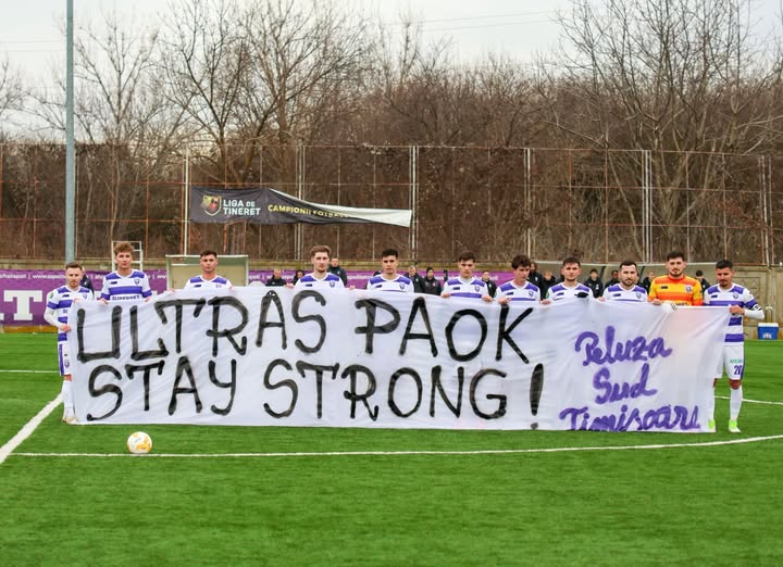 Οι ποδοσφαιριστές της ρουμανικής ομάδας στάθηκαν στο κέντρο του γηπέδου, αποτίοντας φόρο τιμής στα θύματα, ενώ λίγο αργότερα ύψωσαν πανό με το μήνυμα της Peluzei Sud Timișoara: «Ultras PAOK / Stay strong!». Μια εικόνα που ξεπέρασε τα όρια του αγωνιστικού χώρου και ανέδειξε την αλληλεγγύη που ενώνει τους φιλάθλους, ανεξαρτήτως χρωμάτων και συνόρων.