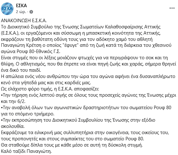 «O πρόεδρος και τα μέλη του Δ.Σ. της Ελληνικής Ομοσπονδίας Καλαθοσφαίρισης εκφράζουν την οδύνη τους στο άκουσμα της τραγικής απώλειας του αθλητή Παναγιώτη Κρέτση, κατά τη διάρκεια του χθεσινού αγώνα της ομάδας Ρουφ80.