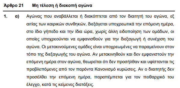 Η διαδικασία αυτή προβλέπεται ξεκάθαρα από τον ΚΑΠ της ΕΠΟ. Συγκεκριμένα, το άρθρο 21, παράγραφος 1α, ορίζει ότι σε περίπτωση αναβολής αγώνα λόγω δυσμενών καιρικών συνθηκών, οι ομάδες υποχρεούνται να παρουσιαστούν την ίδια ώρα της επόμενης ημέρας, προκειμένου να διαπιστωθεί από την αρμόδια αρχή αν πληρούνται πλέον οι προϋποθέσεις για την ομαλή διεξαγωγή του αγώνα.