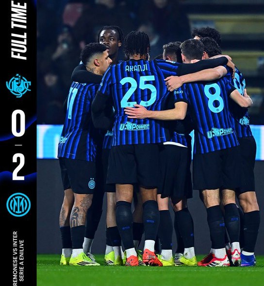 Η Ίντερ έκανε ακόμη ένα βήμα τίτλου, περνώντας με 2-0 από την έδρα της Κρεμονέζε και φτάνοντας στο +8 από τη Μίλαν, με παιχνίδι περισσότερο. Οι «νερατζούρι» άνοιξαν το σκορ στο 16’ με τον Λαουτάρο, μετά από κόρνερ του Ντιμάρκο, και στο 31’ ο Ζιελίνσκι με δυνατό σουτ έγραψε το 0-2. Νωρίτερα, οι γηπεδούχοι είχαν μεγάλη ευκαιρία με τον Βάρντι, ενώ στο δεύτερο μέρος υπήρξε διακοπή όταν κροτίδα τραυμάτισε τον Αουντέρο. Η Κρεμονέζε άγγιξε το γκολ στο 85’ με δοκάρι του Τζερμπίν.