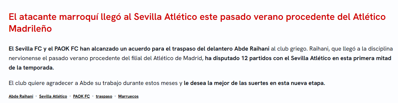 Ο Αμπντέ Ραϊχανί ανοίγει νέο κεφάλαιο στην καριέρα του, καθώς ο ΠΑΟΚ ήρθε σε συμφωνία με τη Σεβίλλη για την απόκτηση του νεαρού επιθετικού. Ο 22χρονος Μαροκινός σέντερ φορ (γεν. 3 Φεβρουαρίου 2004) μετακομίζει στην Ελλάδα μετά από ένα εξάμηνο παρουσίας στη δεύτερη ομάδα των Ανδαλουσιάνων.