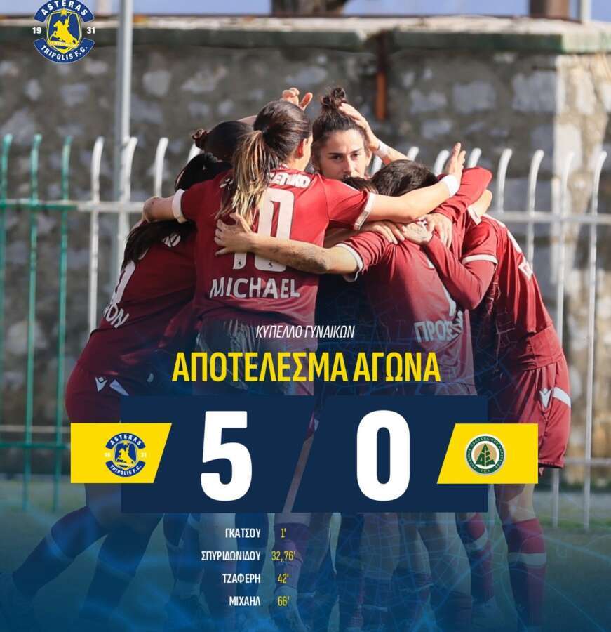 Εντυπωσιακή εμφάνιση και πρόκριση για τον Αστέρα Τρίπολης, που όχι μόνο ανέτρεψε το εις βάρος του σκορ αλλά έφτασε στο ευρύ 5-0 επί του ΑΟ ΡΕΑ. Η ομάδα της Αρκαδίας συνεχίζει στον θεσμό του Κυπέλλου και θα συμμετέχει στα ημιτελικά, εκεί που θα αγωνιστεί και ο ΠΑΟΚ που απέκλεισε τη Μύκονο.