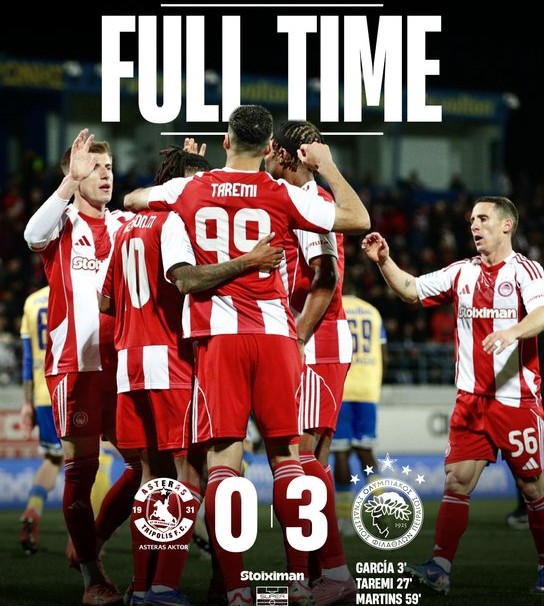Με τον πιο πειστικό τρόπο ο Ολυμπιακός επιβεβαίωσε την αγωνιστική του ανωτερότητα στο εξ αναβολής παιχνίδι της 17ης αγωνιστικής, επικρατώντας με 3-0 του Αστέρα AKTOR στην Τρίπολη και ανεβαίνοντας μόνος στην κορυφή της βαθμολογίας με 46 βαθμούς. Οι «ερυθρόλευκοι» του Χοσέ Μεντιλίμπαρ μπήκαν από το πρώτο λεπτό αποφασισμένοι να «τελειώσουν» το ματς νωρίς και το κατάφεραν με απόλυτο έλεγχο και ουσία.
