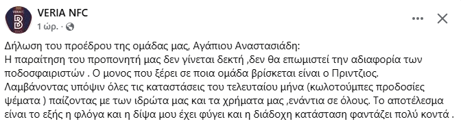 Με επίσημη δήλωση του προέδρου Αγάπιου Αναστασιάδη, η Βέροια τοποθετήθηκε δημόσια για τις εξελίξεις μετά το 0-0 με τον Πιερικό, ξεκαθαρίζοντας πως η παραίτηση του προπονητή Δημήτρη Πρίντζιου δεν γίνεται δεκτή. Ο ισχυρός άνδρας της ομάδας τόνισε ότι ο τεχνικός δεν πρόκειται να επωμιστεί «την αδιαφορία των ποδοσφαιριστών», υπογραμμίζοντας πως είναι «ο μόνος που ξέρει σε ποια ομάδα βρίσκεται».