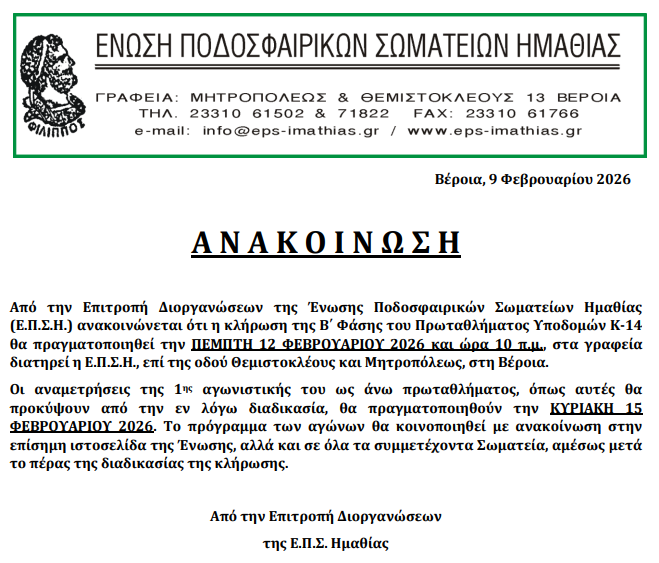 Την Πέμπτη 12 Φεβρουαρίου και ώρα 10:00 π.μ. θα πραγματοποιηθεί η κλήρωση της Β’ Φάσης του Πρωταθλήματος Υποδομών Κ14 της ΕΠΣ Ημαθίας. Από την κλήρωση θα προκύψουν τα ζευγάρια της 1ης αγωνιστικής, οι αγώνες της οποίας έχουν οριστεί για την Κυριακή 15 Φεβρουαρίου.