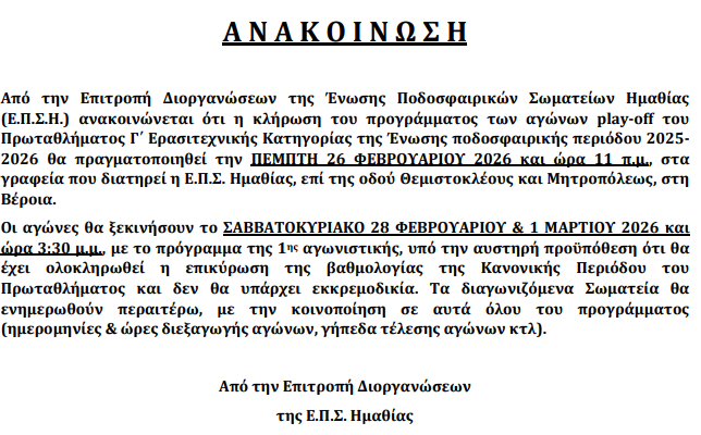 Η ΕΠΣ Ημαθίας γνωστοποίησε τις λεπτομέρειες για την κλήρωση του προγράμματος των αγώνων play-off του Πρωταθλήματος Γ΄ Ερασιτεχνικής Κατηγορίας. Η διαδικασία θα πραγματοποιηθεί την Πέμπτη 26 Φεβρουαρίου 2026 και ώρα 11:00 π.μ., στα γραφεία της Ένωσης στη Βέροια.
