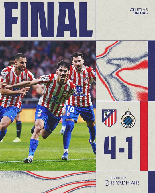 Η Ατλέτικο Μαδρίτης επέβαλε τον ρυθμό της στο «Μετροπολιτάνο» και με το εμφατικό 4-1 απέναντι στην Κλαμπ Μπριζ σφράγισε την πρόκριση στους «16» του Champions League, αφήνοντας τους Βέλγους –και τον Χρήστο Τζόλη– εκτός συνέχειας. Παρά το ισορροπημένο πρώτο μέρος (1-1), οι «ροχιμπλάνκος» κυριάρχησαν στην επανάληψη και με πρωταγωνιστή τον Αλεξάντερ Σέρλοθ μετέτρεψαν το ματς σε παράσταση ισχύος.