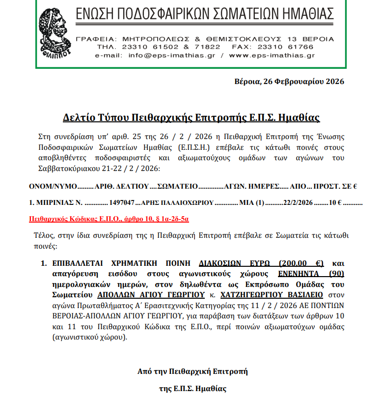 Η Πειθαρχική Επιτροπή της ΕΠΣ Ημαθίας ανακοίνωσε τις αποφάσεις για τους αγώνες του Σαββατοκύριακου 21–22/2/2026. Σε ποδοσφαιριστή του Άρη Παλαιοχωρίου επιβλήθηκε ποινή μίας (1) αγωνιστικής ημέρας, με ισχύ από 22/2/2026, καθώς και χρηματικό πρόστιμο 10€. Παράλληλα, επιβλήθηκαν κυρώσεις σε αξιωματούχο του Απόλλωνα Αγίου Γεωργίου επιβλήθηκε χρηματική ποινή 200€ και απαγόρευση εισόδου στους αγωνιστικούς χώρους για 90 ημερολογιακές ημέρες.