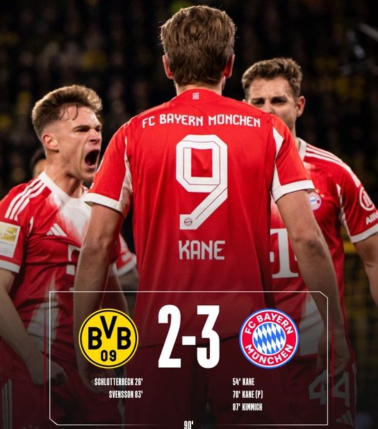 Οι γηπεδούχοι προηγήθηκαν στο 26’ με κεφαλιά του Σλότερμπεκ, αλλά οι Βαυαροί αντέδρασαν γρήγορα. Στο 54’ ο Κέιν ισοφάρισε σε 1-1 μετά από κεφαλιά–πάσα του Γκνάμπρι, ενώ στο 69’ κέρδισε και εκτέλεσε πέναλτι για το 1-2. Η Ντόρτμουντ ισοφάρισε προσωρινά στο 83’ με γυριστό του Σβένσον, όμως η απάντηση ήταν άμεση: στο 87’ ο Κίμιχ εκτέλεσε άψογα πέναλτι για το τελικό 2-3. Παρά τις ευκαιρίες εκατέρωθεν και τα δοκάρια, η Μπάγερν κράτησε το προβάδισμα και πλέον πλησιάζει στο να κλείσει τον τίτλο.