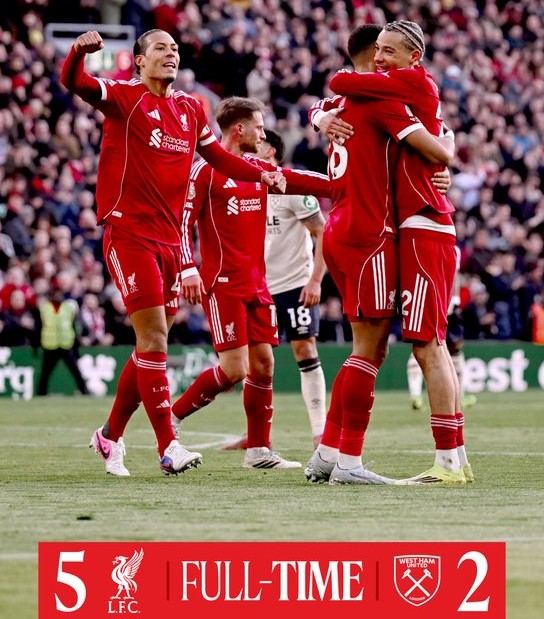 Η Λίβερπουλ συνέχισε την εντυπωσιακή της παράδοση απέναντι στη Γουέστ Χαμ στο «Άνφιλντ», επικρατώντας με 5-2 για την 28η αγωνιστική της Premier League και ανεβαίνοντας στην 5η θέση, εν αναμονή του ντέρμπι της Τσέλσι με την Άρσεναλ.