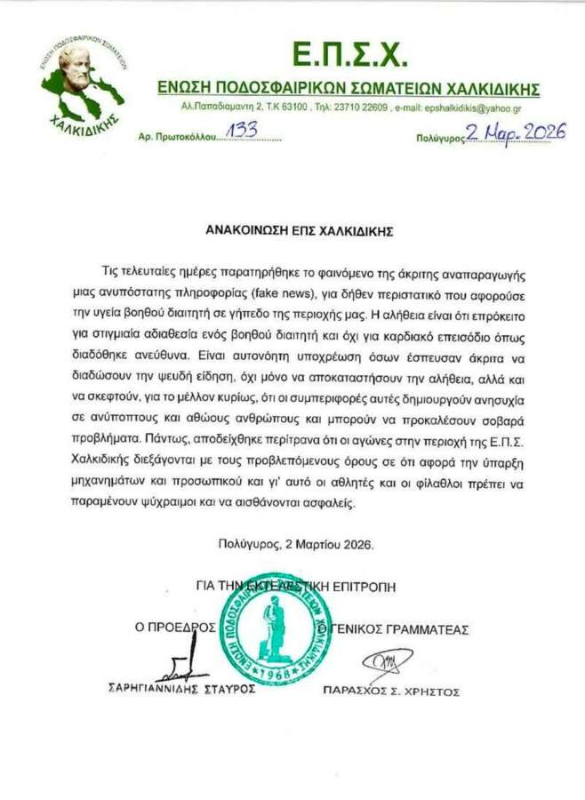 Η ΕΠΣ Χαλκιδικής καλεί όσους αναπαρήγαγαν την είδηση να αποκαταστήσουν την αλήθεια.