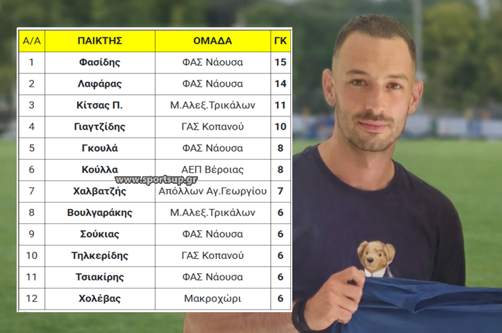 Ο Λαφάρας πέτυχε τέσσερα γκολ στις δύο πιο πρόσφατες αγωνιστικές και έφτασε τα 14, βάζοντας… φωτιά στην εσωτερική κόντρα της Νάουσας για τον τίτλο του πρώτου σκόρερ. Στην τρίτη θέση βρίσκεται ο Παναγιώτης-Δημήτρης Κίτσας του Μ. Αλέξανδρου Τρικάλων με 11 γκολ, ενώ διψήφιο αριθμό τερμάτων έχει και ο Θέμης Γιαγτζίδης του ΓΑΣ Κοπανού με 10.