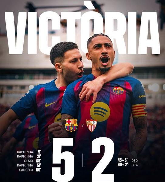 Η Μπαρτσελόνα συνέχισε την πορεία της προς τον τίτλο στη La Liga, επικρατώντας εντυπωσιακά της Σεβίλλης με 5-2 και παραμένοντας στην κορυφή της βαθμολογίας. Οι «μπλαουγκράνα» κυριάρχησαν από νωρίς και προηγήθηκαν 2-0 μέσα σε είκοσι λεπτά με δύο εύστοχα πέναλτι του Ραφίνια, που κέρδισε ο Κανσέλο. Ο Ντάνι Όλμο ανέβασε τον δείκτη του σκορ στο 38’, ενώ η Σεβίλλη μείωσε προσωρινά στις καθυστερήσεις του πρώτου μέρους. Στο δεύτερο ημίχρονο ο Ραφίνια ολοκλήρωσε το χατ-τρικ στο 50’, με τον Κανσέλο να διαμορφώνει λίγο αργότερα το 5-1. Το μόνο που κατάφεραν οι φιλοξενούμενοι ήταν να μειώσουν στο φινάλε για το τελικό 5-2.