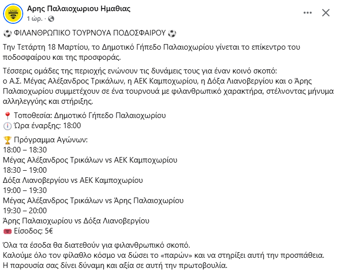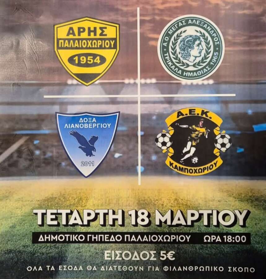 Ο Μέγας Αλέξανδρος Τρικάλων, η ΑΕΚ Καμποχωρίου, η Δόξα Λιανοβεργίου και ο Άρης Παλαιοχωρίου ενώνουν τις δυνάμεις τους, στέλνοντας μήνυμα αλληλεγγύης. Το πρόγραμμα περιλαμβάνει διαδοχικούς αγώνες μικρής διάρκειας, με έντονο αγωνιστικό ενδιαφέρον. Η είσοδος έχει οριστεί στα 5 ευρώ, με όλα τα έσοδα να διατίθενται για φιλανθρωπικό σκοπό.