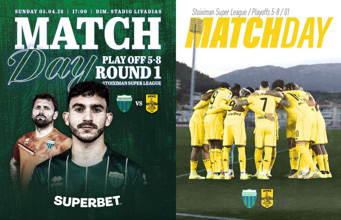 Μπορεί να είναι εικόνα κείμενο που λέει "SUNDAY 05.04.26 I 17:00 I DIM. STADIO LIVADIAS STA STARTING Лeνεη Pocn PLAY PLAYOFT5-8 OFF OFF5-8 ROUND1 STOIXIMAN SUPER LEAGUE STARTERS LODYGIN TSAPRAS VIHOS MAGNUSSON LIAGKAS COKAJ KOSTI BALZI VERBIC PALACIOS OZBOLT EЛC ANACKER SOURDIS KORNEZOS LAYOUS NIKAS PAPADOPOULOS LAMARANA SYMELIDIS •OZEGOVIC TSIVELEKIDIS GKOUMAS MANTHATIS MBABEIAKOT ΑΡΗΣ VS SUPERBET 21+"