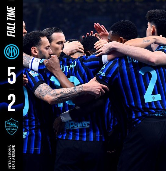 Η Ίντερ πραγματοποίησε εντυπωσιακή εμφάνιση στο «Μεάτσα», επικρατώντας με 5-2 της Ρόμα και κάνοντας αποφασιστικό βήμα για την κατάκτηση της Serie A, επτά αγωνιστικές πριν το φινάλε.