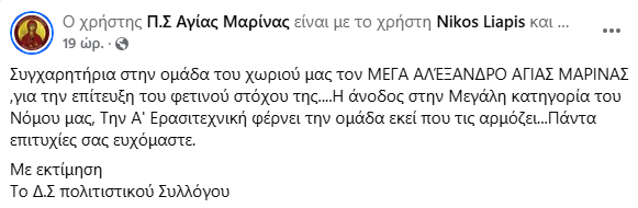 Συγχαρητήρια ανακοίνωση εξέδωσε ο Πολιτιστικός Σύλλογος Αγίας Μαρίνας :