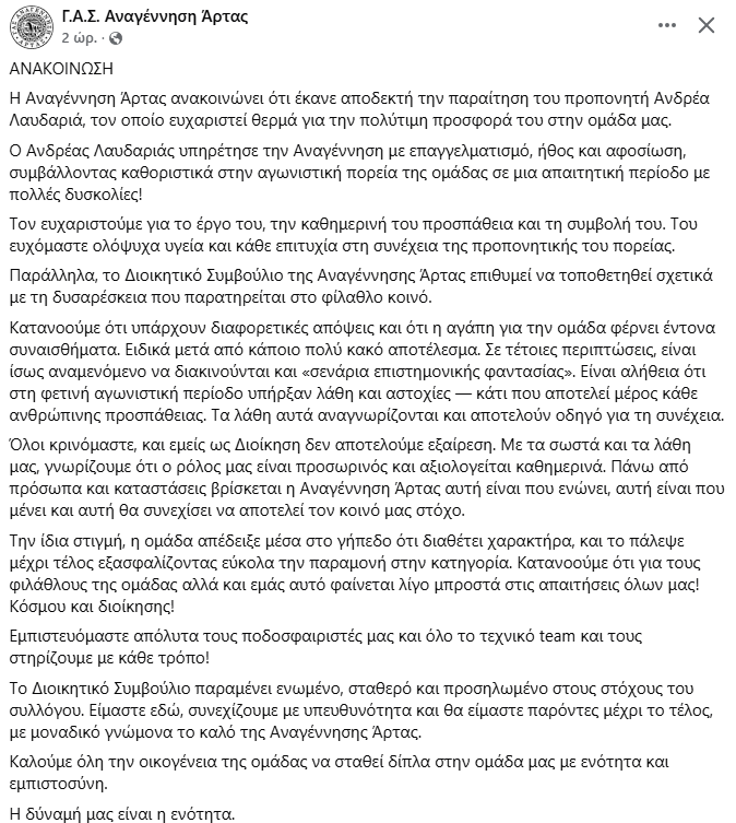 Η Αναγέννηση Άρτας έκανε δεκτή την παραίτηση του Ανδρέα Λαυδαριά, ευχαριστώντας τον για την προσφορά του. Η διοίκηση αναγνώρισε λάθη στη σεζόν, στάθηκε στην εξασφάλιση της παραμονής και κάλεσε τον κόσμο σε ενότητα, τονίζοντας την εμπιστοσύνη σε ποδοσφαιριστές και τεχνικό επιτελείο για τη συνέχεια.