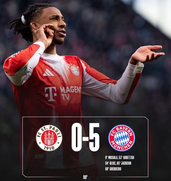 Δεν αφήνει περιθώρια αμφισβήτησης η Μπάγερν Μονάχου, που συνεχίζει την ξέφρενη πορεία της προς την κατάκτηση της Bundesliga. Η ομάδα του Βινσέντ Κομπανί συνέτριψε με 5-0 τη Ζανκτ Πάουλι, φτάνοντας τα 105 γκολ στο πρωτάθλημα και αγγίζοντας πλέον και μαθηματικά τον τίτλο.