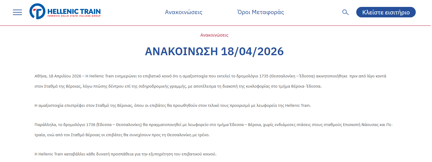 Όπως αναφέρει σε ανακοίνωση η Hellenic Train αποτέλεσμα ήταν η διακοπή της κυκλοφορίας στο τμήμα Βέροια- Έδεσσα. Η αμαξοστοιχία επέστρεψε στον Σταθμό της Βέροιας, όπου οι επιβάτες θα προωθηθούν στον τελικό τους προορισμό με λεωφορείο της εταιρίας.