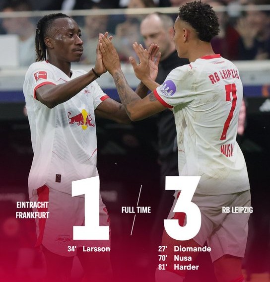 Το πρώτο μέρος είχε ρυθμό και φάσεις, με τον Ντιομαντέ να ανοίγει το σκορ στο 27’, πριν ο Λάρσον ισοφαρίσει στο 34’ για την Άιντραχτ. Στην επανάληψη, η Λειψία ανέβασε την απόδοσή της και κυριάρχησε πλήρως. Στο τελευταίο εικοσάλεπτο «καθάρισε» το ματς, με τον Νούσα να κάνει το 2-1 στο 70’ και να δημιουργεί το τρίτο γκολ για τον Χάρντερ στο 81’.