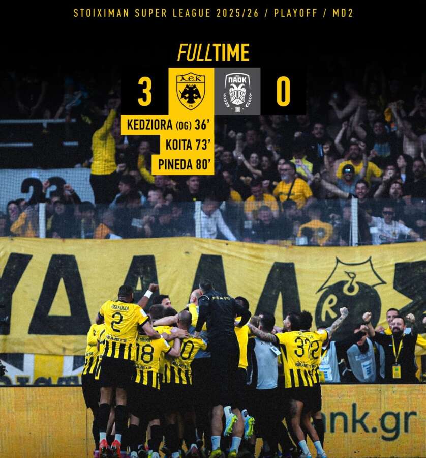 Το τελικό σφύριγμα βρήκε την ΑΕΚ να πανηγυρίζει μια νίκη τίτλου, τόσο για τη βαθμολογική σημασία όσο και για τον τρόπο που επιβλήθηκε του βασικού της ανταγωνιστή. Με σταθερότητα, ένταση και αποτελεσματικότητα, η ομάδα του Ματίας Αλμέιδα δείχνει έτοιμη να επιστρέψει στην κορυφή.