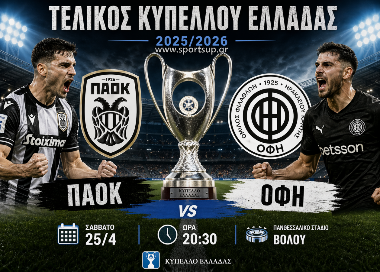 Το Πανθεσσαλικό Στάδιο του Βόλου φιλοξενεί το Σάββατο 25 Απριλίου (20:30) τον μεγάλο τελικό του Κυπέλλου Ελλάδας 2025/2026, με τον ΠΑΟΚ και τον ΟΦΗ να διεκδικούν το τρόπαιο σε μια αναμέτρηση που συγκεντρώνει όλα τα στοιχεία ενός μεγάλου ποδοσφαιρικού ραντεβού. Δύο ομάδες με διαφορετική διαδρομή μέσα στη σεζόν, αλλά με κοινό παρονομαστή τη συνέπεια και την αποτελεσματικότητα στα κρίσιμα σημεία, φτάνουν δικαίως στο τελευταίο βήμα.