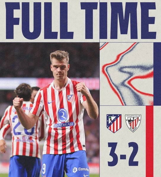 Με πρωταγωνιστή το δεύτερο ημίχρονο, η Ατλέτικο Μαδρίτης επικράτησε 3-2 της Αθλέτικ Μπιλμπάο και ουσιαστικά «κλείδωσε» την τέταρτη θέση, ανοίγοντας διαφορά δέκα βαθμών από τη Μπέτις. Οι Βάσκοι προηγήθηκαν στο 23’ με τον Παρέδες, εκμεταλλευόμενοι στατική φάση, όμως οι «ροχιμπλάνκος» αντέδρασαν άμεσα μετά την ανάπαυλα. Ο Γκριεζμάν (49’) και ο Σόρλοτ (54’) ανέτρεψαν το σκορ, με τον Νορβηγό να σκοράρει ξανά στις καθυστερήσεις. Το τελικό 3-2 διαμόρφωσε ο Γουρουθέτα στο 90+7’, χωρίς να αλλάξει την ουσία για την ομάδα του Βαλβέρδε.