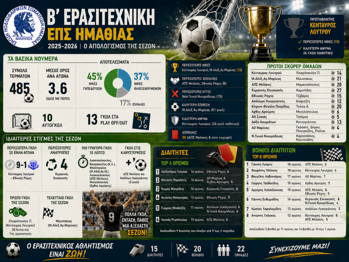 Πλούσια σε θέαμα και παραγωγικότητα ήταν η φετινή αγωνιστική περίοδος στη Β Ερασιτεχνική της ΕΠΣ Ημαθίας, όπως προκύπτει από τα στοιχεία της βάσης δεδομένων του sportsup.gr. Συνολικά σημειώθηκαν 485 τέρματα, με τον μέσο όρο να διατηρείται στο 3.6 γκολ ανά παιχνίδι, ίδιος με την περσινή σεζόν, επιβεβαιώνοντας τη σταθερή επιθετική τάση των ομάδων.
