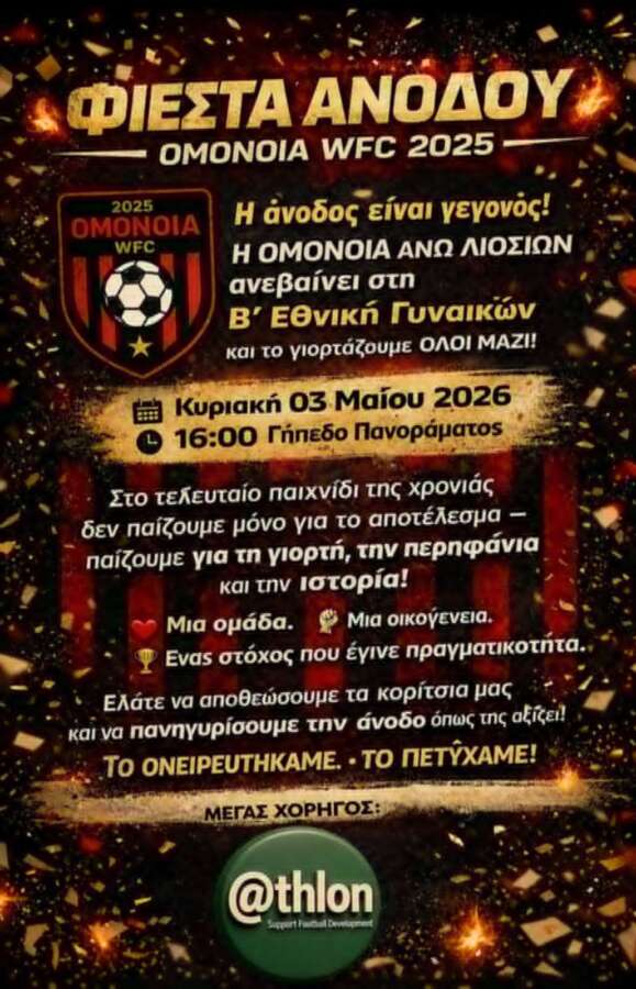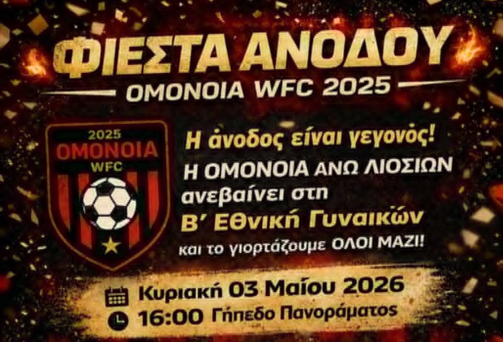 Η Ομόνοια Άνω Λιοσίων ετοιμάζεται να γιορτάσει μια ιστορική επιτυχία, καθώς η γυναικεία ομάδα εξασφάλισε την άνοδο στη Β’ Εθνική. Την Κυριακή 3 Μαΐου 2026 στις 16:00, στο γήπεδο Πανοράματος, θα πραγματοποιηθεί η φιέστα στο τελευταίο παιχνίδι της σεζόν, σε ένα ματς με έντονο συμβολισμό.
